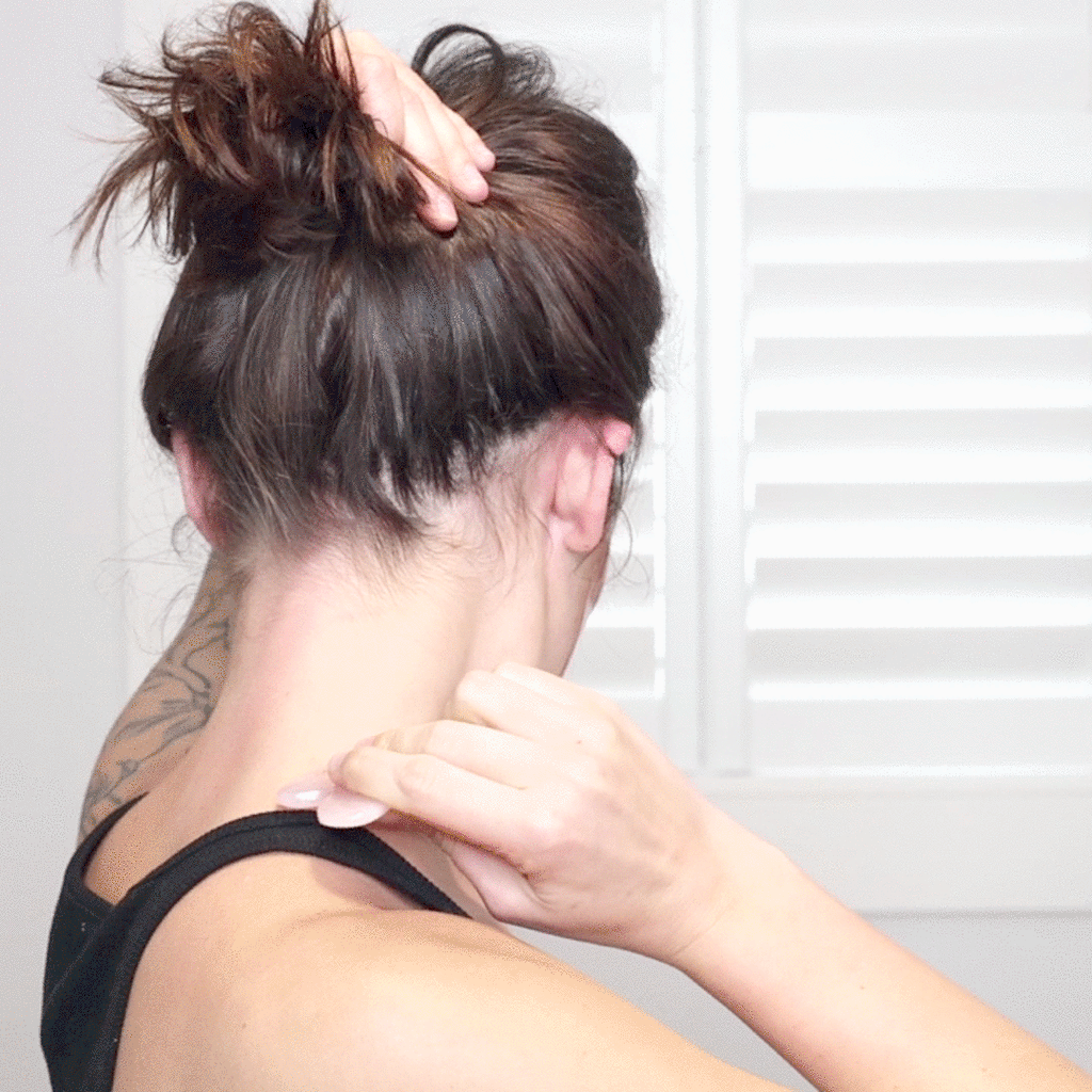 Using the curved edge, glide along chest and neck.